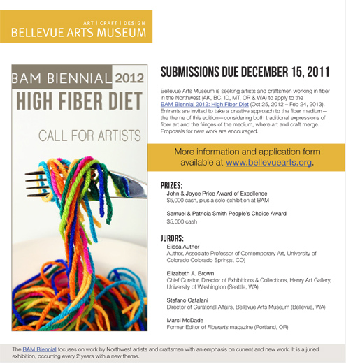 Bellevue Arts Museum is launching the call for artists for the second edition of the BAM Biennial. This year’s medium and theme is fiber, hence BAM Biennial 2012: High Fiber Diet. The Biennial is open to artists and makers from Washington, Oregon, Idaho, Montana, Alaska and British Columbia.