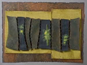 Some of the metal-framed work she did had openings where you could see past the quilted fiber pieces to the wall. She did enjoy working with the negative space, but realized she wasn’t choosing the composition because she did not control the color of the back wall.