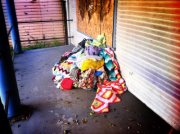 He has all the afghans and granny squares he could find at all the area Goodwills and materials you can use to make your own squares to add or embroider your name or images or anything you want [within reason] to the wall of this building.