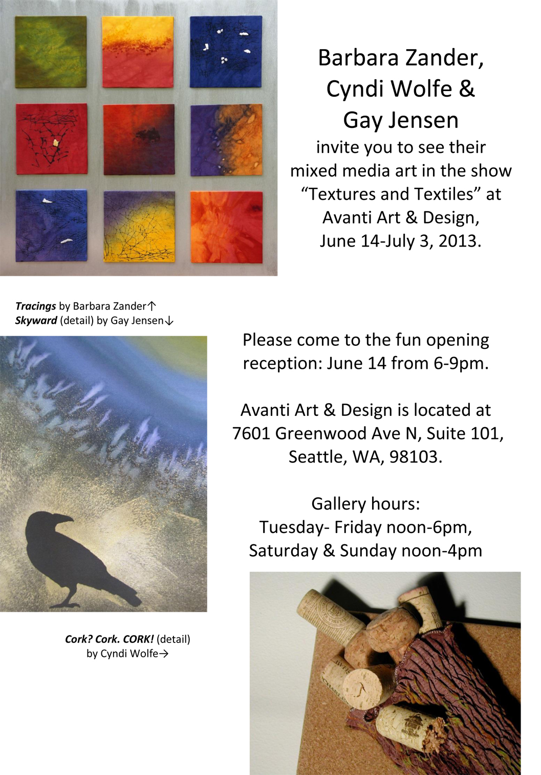 “Textures & Textiles”, a multi media show exploring the uses of texture and/or textiles opens June 14th at Avanti Art & Design in the Greenwood neighborhood. SDA Members including Gay Jensen, Barb Zander and Cyndi Wolfe are participating in this show. Please come to the opening reception on June 14th from 6 – 9 pm and support your fellow SDA members. The show will hang from June 14th through July 3rd.