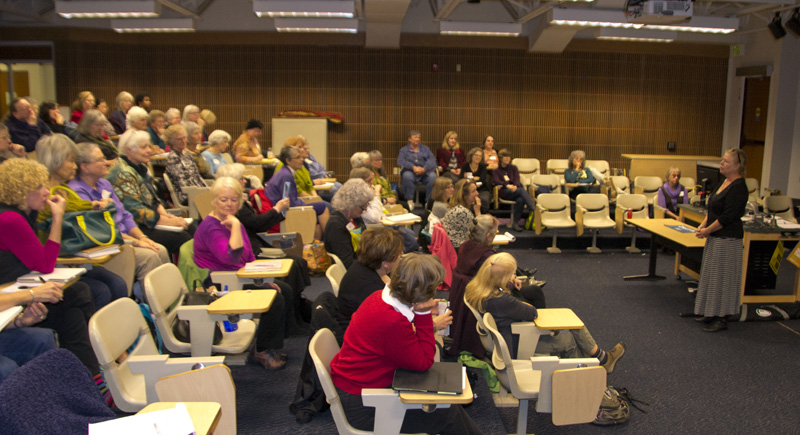 When asked “What part of Jane Dunnewold’s presentation (click link to see a write-up of SDA president Jane’s talk_ can you relate to?” there were numerous reactions. One of the main things that blocks many in this group is what Jane calls “The Committee.” It’s so easy to be hard on oneself. The committee resides in our own minds and points out our mistakes and every little shortfall, reducing our confidence. To overcome this, we need to learn how to play… and then learn by playing. Rather than being afraid to make mistakes, we need to make more! We learn a great deal by making mistakes and if we aren’t making any, then we’re not trying hard enough. Both playing and making mistakes are part of building creative stamina, which is important to develop our artistic muscles. Some of Jane’s suggestions for gaining creative stamina resonated with this group: free association exercises with a list of words and the image that they conjure; a form of journaling and sketching; taking a photo every day; and the art of intentional noticing.