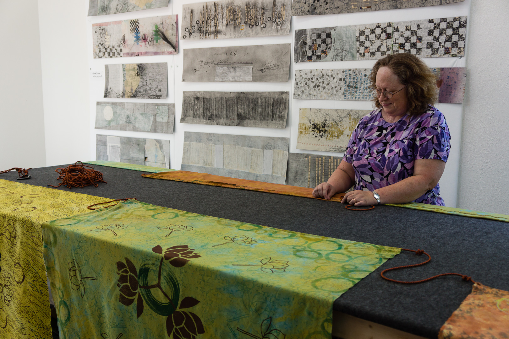 Deb Taylor working in Jane Dunnewold’s San Antonio studio, assisting with Sharon Rowley’s Prayer Flag installation, 2013