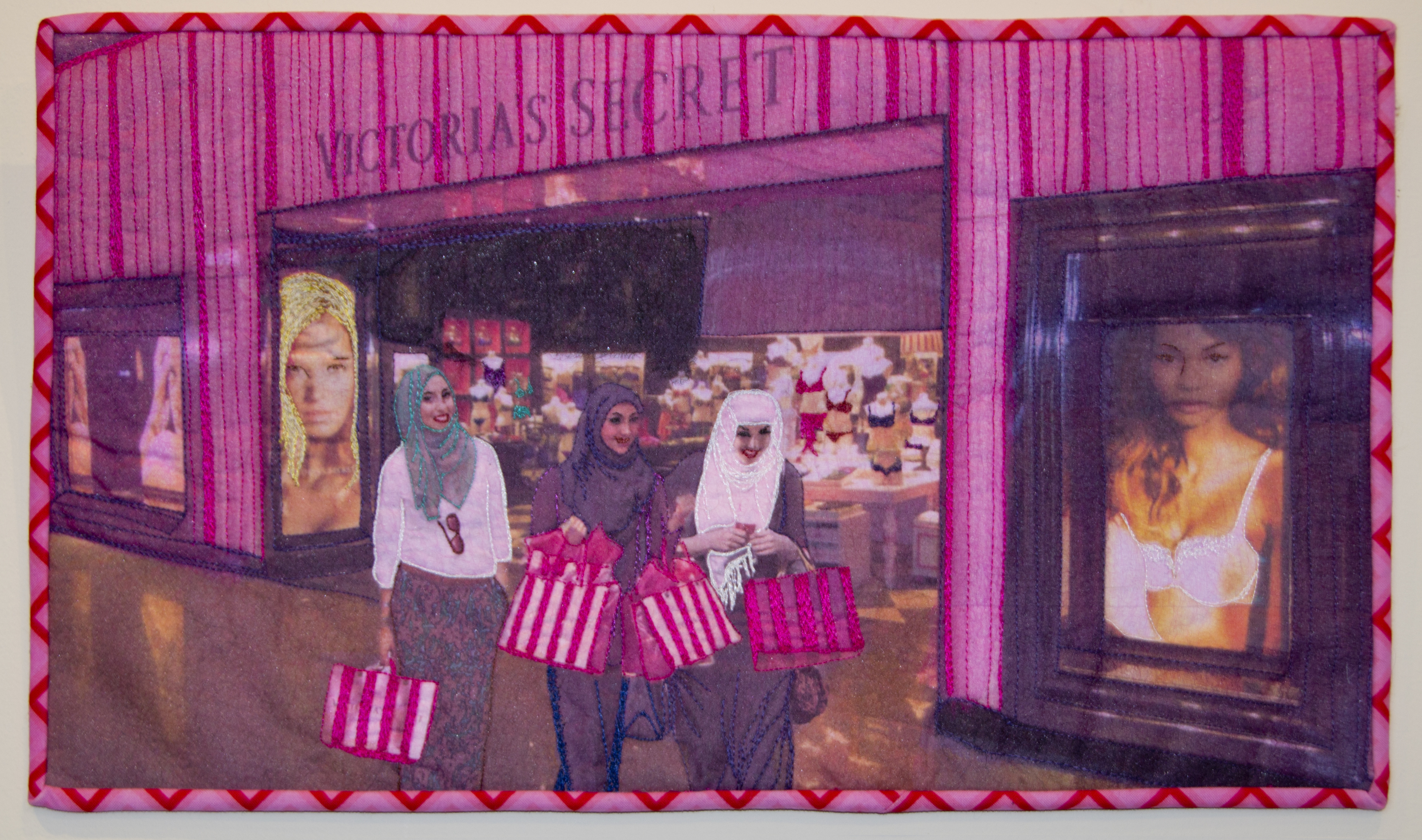 “Frayed Holes” by Deb Taylor – 2015. Chambray fabric, painted cotton batting, screen printing, quilting, beads. The work is a later addition to the Fiber 19 group Beyond Blue collaborative project.