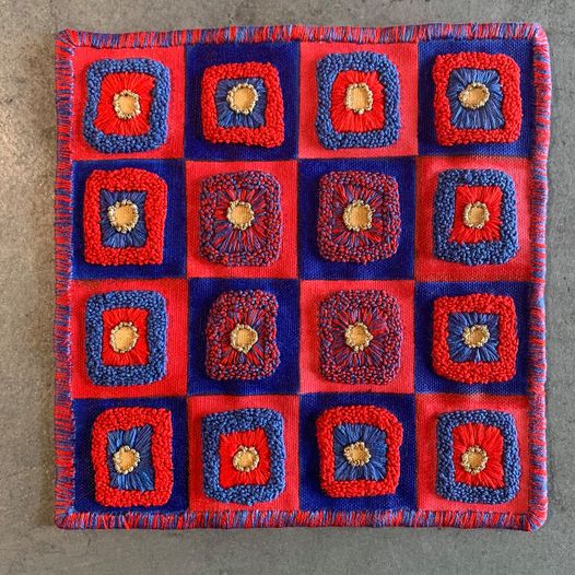 VIOLET PROTEST SQUARE OF THE WEEK – made by Glenda Guinn Gilles from Kirkland, WA – Besides the exquisite embroidery detail, this square reflects the desire for unity after these turbulent times – red and blue mixing together to form a unified core. Each of us occupies our separate life with its concerns, hopes, and challenges. But if we can find a way to face our challenges together, our nation can blend all its beautiful diversity, nurture the treasures we possess and build a nation that truly reflects the America we’ve all heard about and believe can be possible. https://www.facebook.com/thevioletprotest/