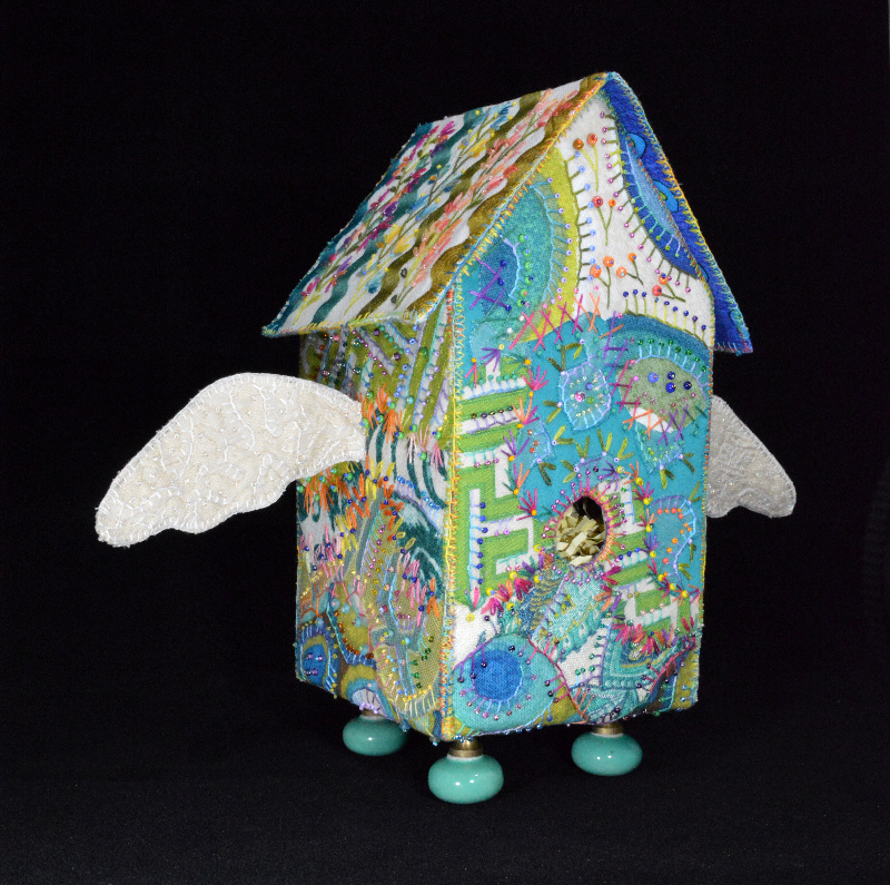Pat creates to fill her life with joy, to discover how to mix colors and textures, to honor the environment and to keep her brain nimble.Whimsy, color and the natural world inspire her work. Mixing fiber, thread, beads, trinkets, shells, stones and found objects – man made and natural – Pat creates jewelry, sculptures, wall hangings, critters and dolls. Most are hand sewn adding one bead at a time. The smaller the bead the better. Her work is often embellished with embroidery. She has fun making, so when people see her work, we hope it makes them smile.