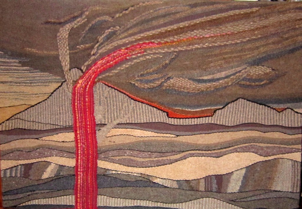 ” I created them perhaps 25 years ago and a friend purchased both pieces. She has proudly displayed them for all these years. One is a large floor pillow. She and I and husbands shared the hippie years when we had living rooms with nothing but carpet and pillows. Mine have mostly gone but she continued to use her pillow, yet I’m surprised how clean it looks. The tapestry is Mt. St. Helens blowing on May 18 of 1980. I watched that from the high deck from my house and soon started on the tapestry. Three months later when the annual event of Bumbershoot was at the Seattle Center they set up a large gallery of juried art that was about the volcano and mine was included.